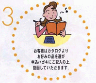 | | 贈り先様→ | 3.ご自宅でゆっくりお好きな品を選んでいただく 4.同封のハガキに希望の品をご記入いただき投函 |